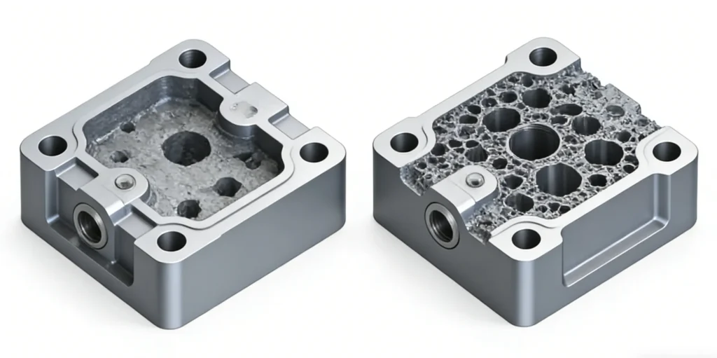 • The intensification pressure applied during injection is maintained for a critical few seconds. This “hold time” ensures that additional molten metal is forced into the cavity to compensate for volumetric shrinkage as the aluminum solidifies, minimizing internal porosity and ensuring a dense, strong part structure.