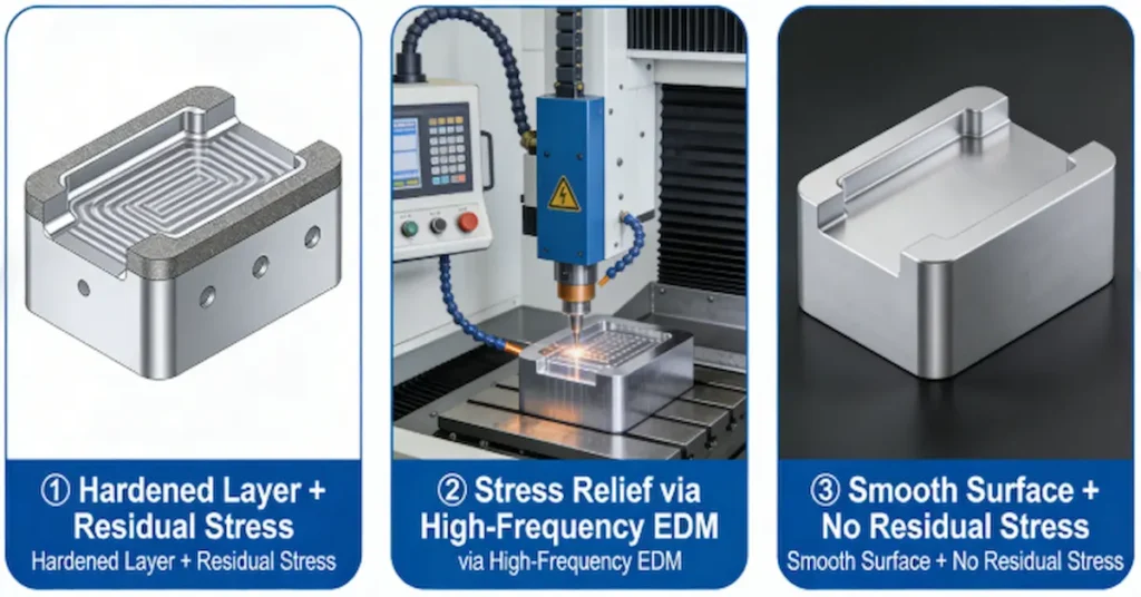 - EDM & Grinding: After electrical discharge machining (EDM), remove the surface hardened layer or relieve stress via high-frequency EDM to eliminate residual stress. During grinding, control coolant volume and avoid excessive feed rates to prevent surface softening and microcracks.