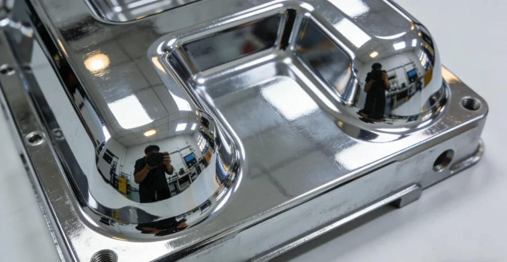 A true mirror polish is a significant cost adder. Expect to pay 2 to 4 times the cost of a standard finish part, depending on the geometry. Complex shapes with hard-to-reach areas are especially expensive to polish.